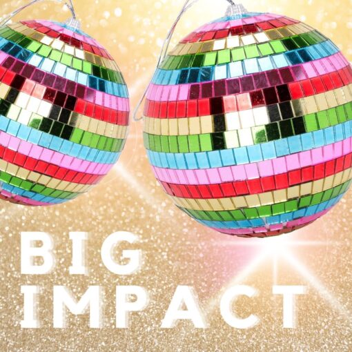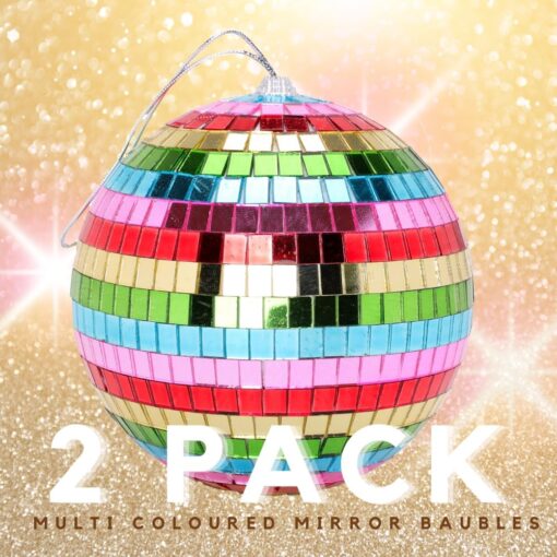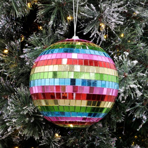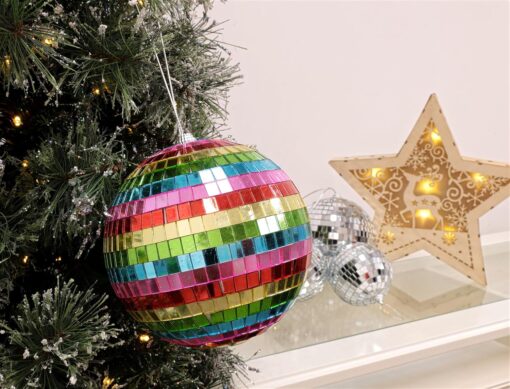 Create a beautiful Christmas display as twinkling fairy lights reflect off this retro disco ball style bauble. This giant bauble measures 150mm (6″) and comes decorated with mini mirrored tiles and a string loop for easy hanging. Made of a lightweight polystyrene, perfect for bringing out year after year as it wont shatter or crack. You will receive 1 multi coloured disco bauble only. Designed and manufactured exclusively for Christmas Concepts Ltd