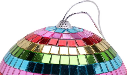 - This giant bauble measures 150mm (6″) and comes decorated with mini mirrored tiles and a string loop for easy hanging.