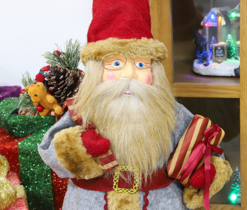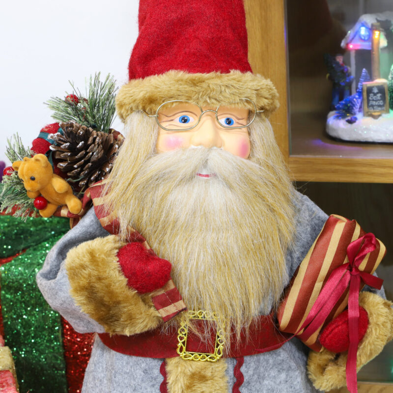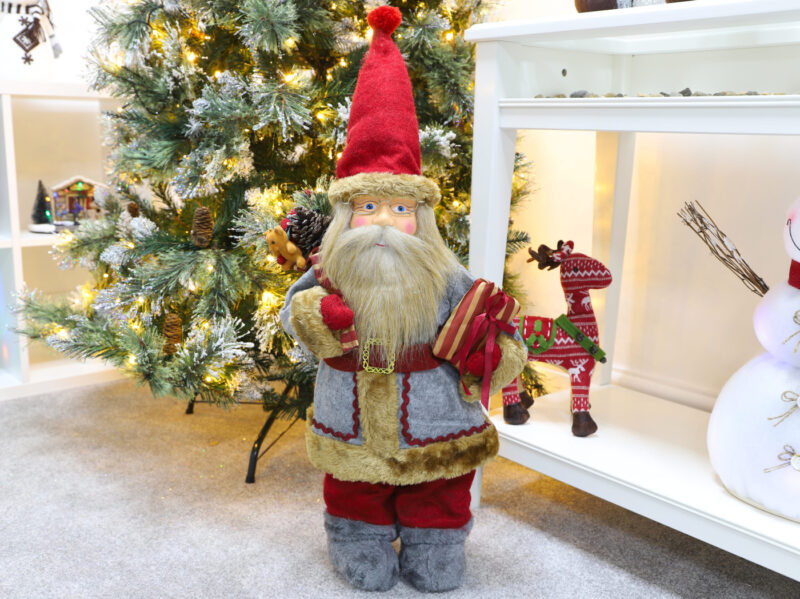 Bring some festive cheer into your home with this standing Santa figure! This jolly character is made with a plush body and a hard plastic face and features telescopic legs which take Santa from 44cm to 58cm. He is dressed in a beautiful traditional outfit including a grey coat with brown fur trim, a red hat, red gloves and red belt with gold buckle. Santas face is brought to life with bright blue eyes, a jolly smile, gold glasses and a long brown beard. He carries a gift in one hand and the other holds a sack topped with decorations that is hung over his shoulder. This Santa would look great standing next to your Christmas tree or as part of a Winter Wonderland theme display! Designed and manufactured exclusivley for Christmas Concepts Ltd.