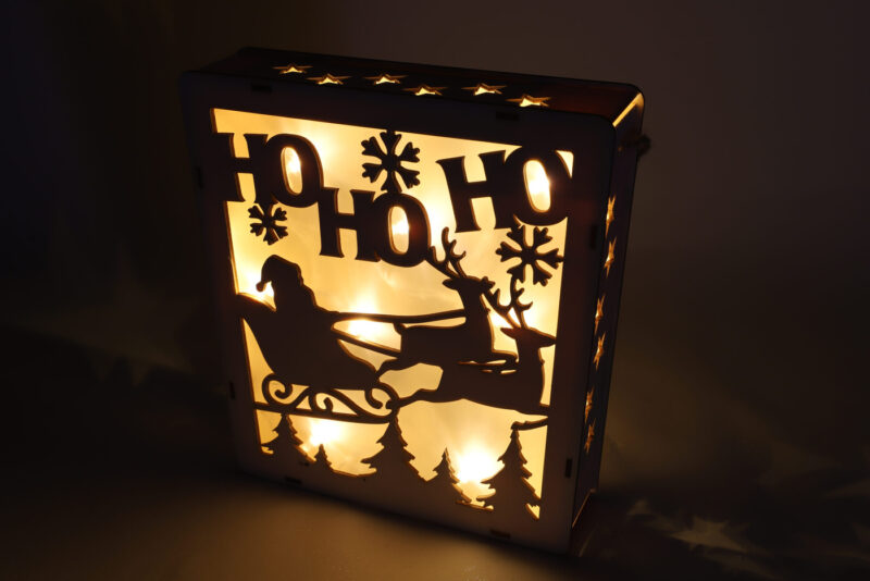 - The wooden box with rope hanger features a festive cut out design of Santa in his sleigh being pulled by two reindeer surrounded by snowflakes, pine trees and “Ho Ho Ho” as well as star cut outs on the sides.