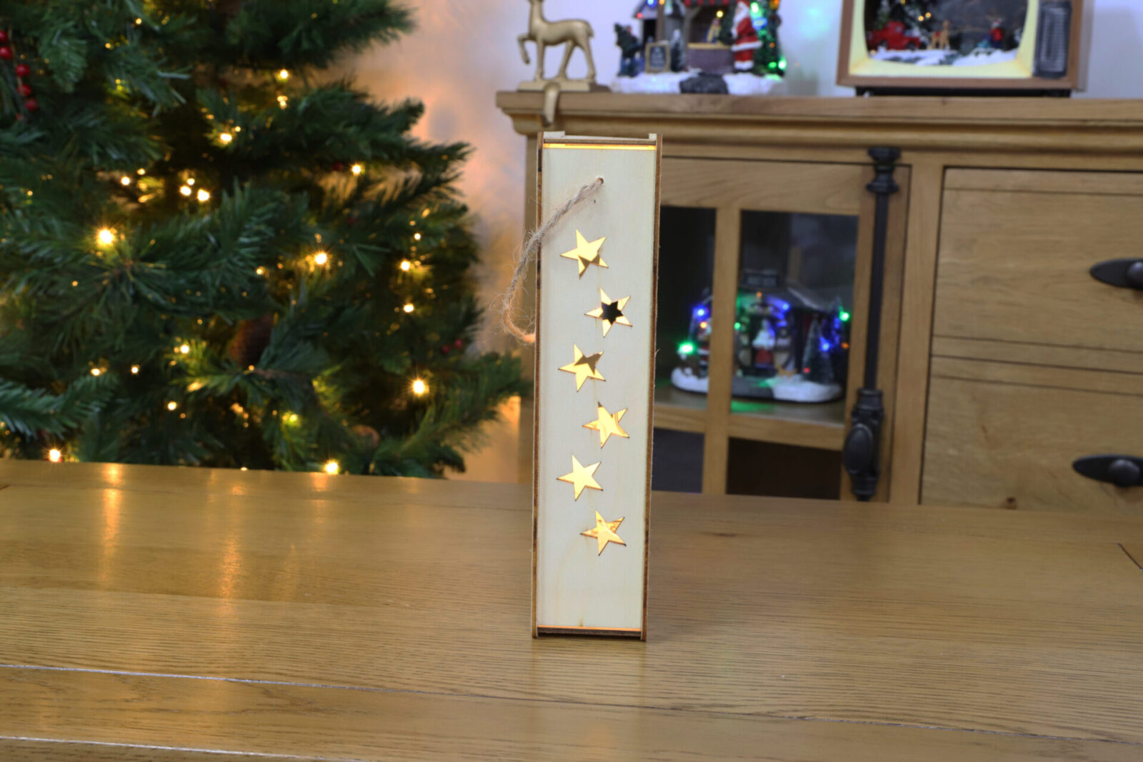 Brighten up your home with this beautiful double sided light up Christmas Silhouette Box! The wooden box with rope hanger features a festive cut out design of Santa in his sleigh being pulled by two reindeer surrounded by snowflakes, pine trees and “Ho Ho Ho” as well as star cut outs on the sides. Inside the box are 8 warm white LED lights that create star patterns on the PVC reflector to give the design that extra bit of sparkle. The box measures 22.5cm x 5.5cm x 24cm and requires 2 x AA batteries (not included). This would look lovely on your mantel piece or hanging in the window! Designed and manufactured exclusively for Christmas Concepts Ltd.