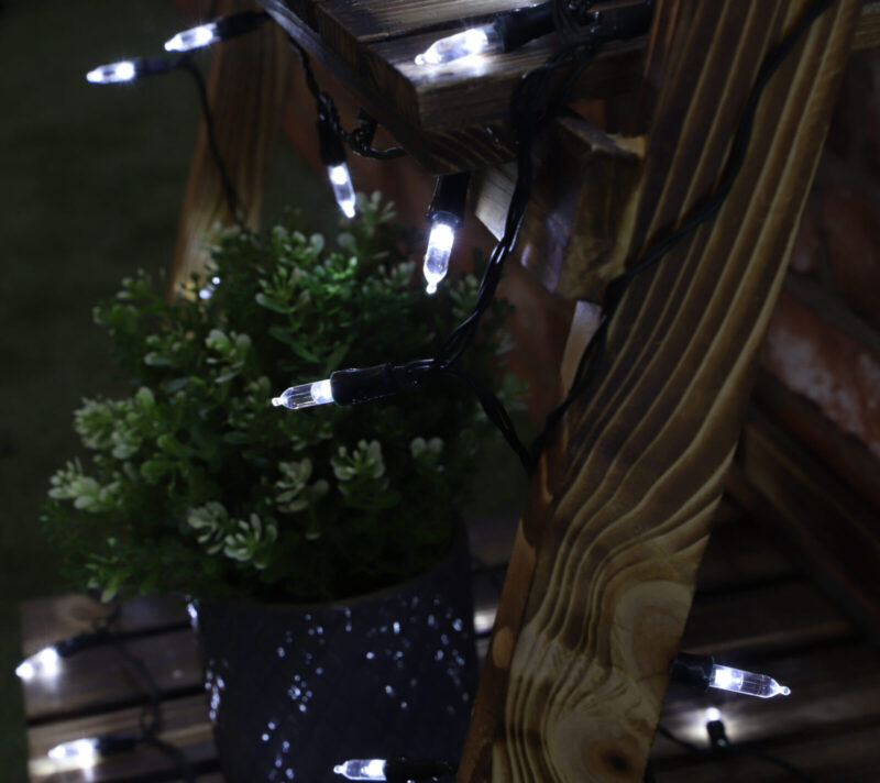 60 white LED chasing fairy lights with green cable with multi funstion timer. 10cm spacing, 30cm lead wire, green cable with weatherproof battery box. These lights are the perfect addition for your Christmas display this year, can be placed indoors or outdoors with the weatherproof battery box. Requires 3 x AA batteries – Please note batteries are not included. Designed and manufactued exclusively for Christmas Concepts Ltd