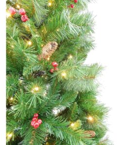 This gorgeous green pine tree is perfect for those traditionalists who prefer less of the bright LED’s and baubles. 400 static warm white LED lights illuminate the tree. The tree is decorated with pinecones and red berries. Measures 84 inches tall and includes foldable base and indoor transformer with 3m lead wire. Designed and manufactured exclusively for Christmas Concepts Ltd.