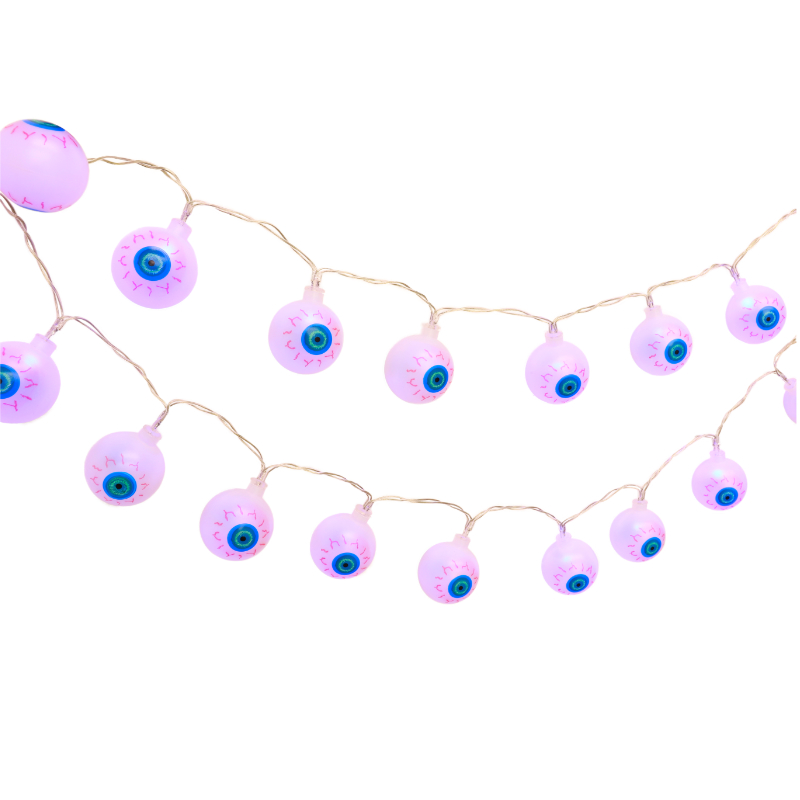These are fantastic lights for Halloween. There are 20 eye balls on the set. Each bat measures approx. 4cm x 4cm and has a blue led light. The lights are on clear cable and there is approx. 50cm lead wire from the last light to the battery box. The set of lights require 2 AA batteries. (not included)