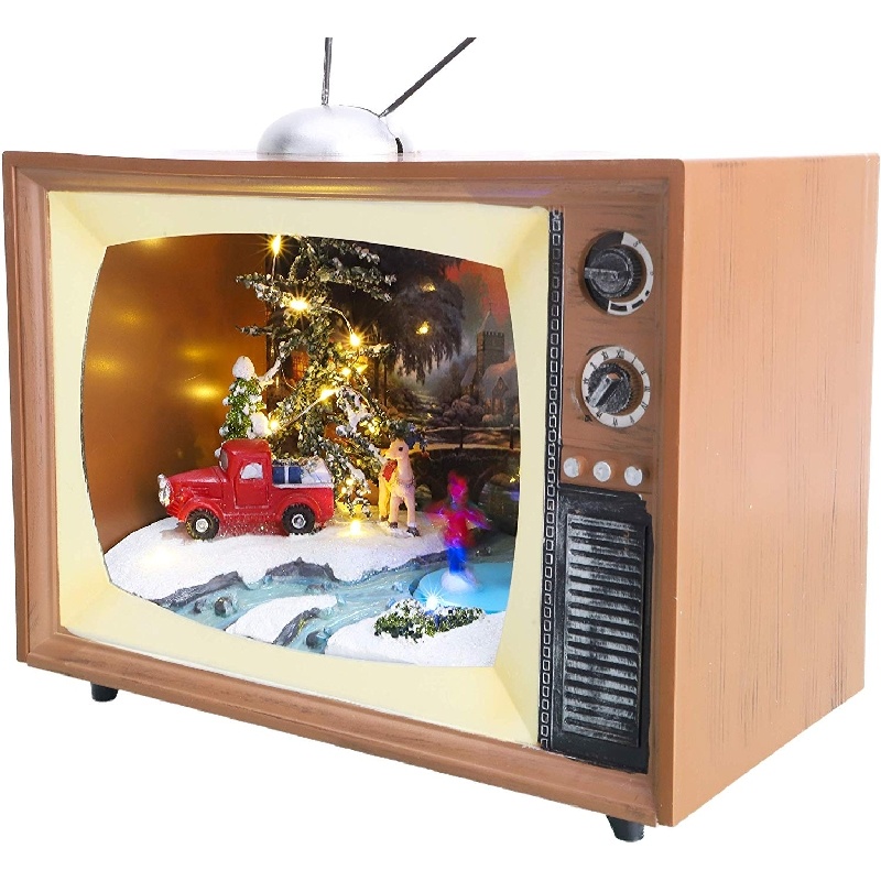 This retro Television scene is the perfect Christmas Decoration to add to your display this year. The televsion scene measures approximately 9.5 Inches and requires 3 x AAA batteries which are not included. The traditional Christmas scene inside the television brings the festive feel to your home. Finished off to the highest standard with rotating ice skating figures and LED Lights. Designed and manufactured exclusively for Christmas Concepts Ltd