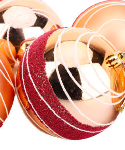 - This pack contains 5 rose gold baubles in total, including an assortment of matte & shiny with red beads and white glitter swirl designs.