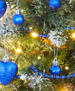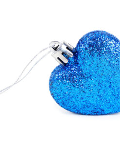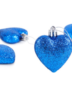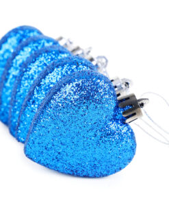 - This pack contains 8 heart baubles in total, decorated with a blue glitter design.