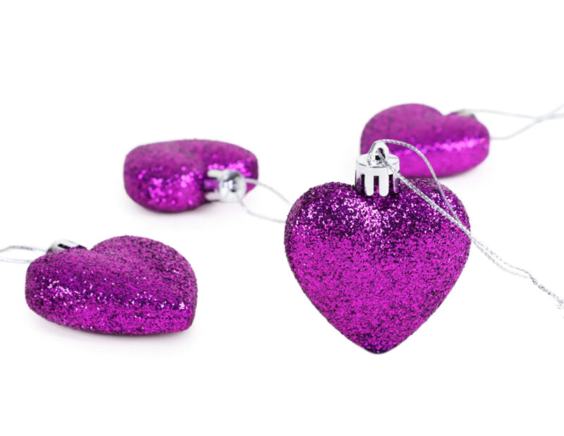 • This pack contains 8 heart baubles in total, decorated with a purple glitter design.