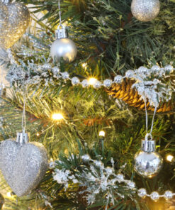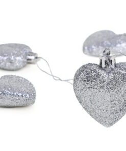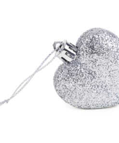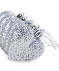 - This pack contains 8 heart baubles in total, decorated with a silver glitter design.