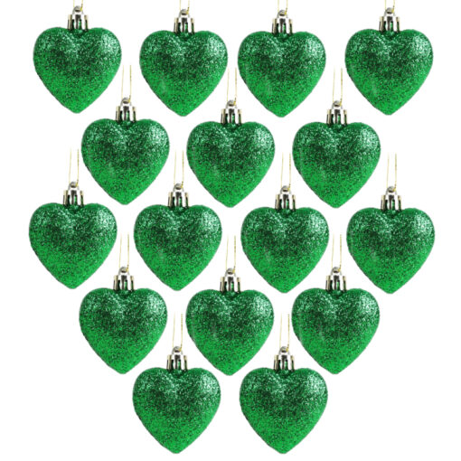Pack of 16 – Glitter Heart Shaped Baubles – Christmas Tree Decorations (Emerald Green)