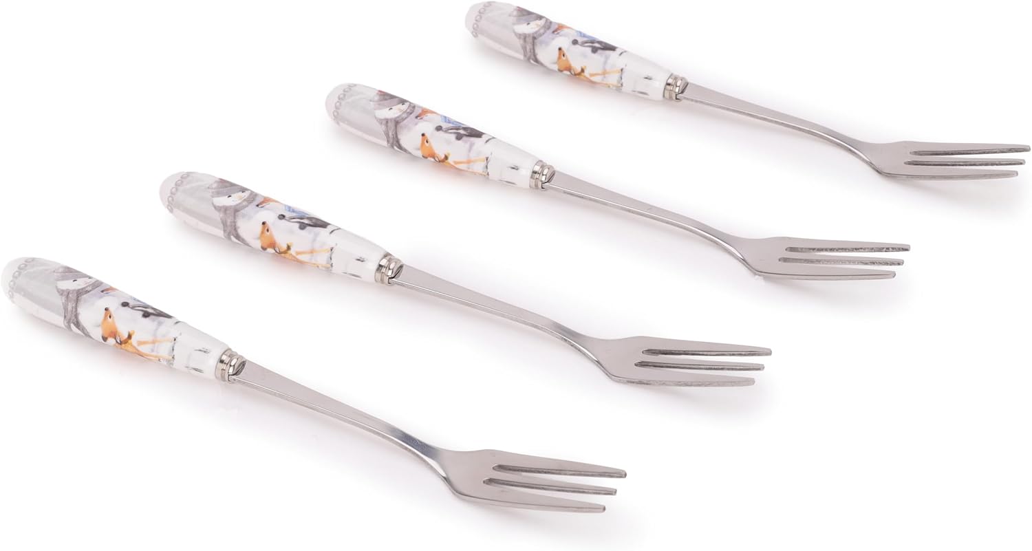 - This luxury pack of 4 cake forks with ceramic handles are decorated with a festive Snowman in a winter wonderland setting, with his forest friends, packaged in a luxury matching gift / storage box.