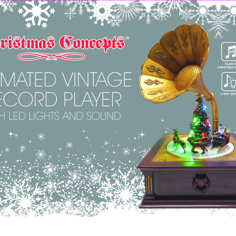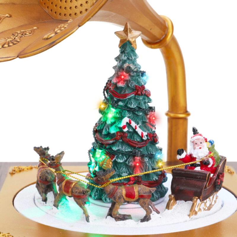 - Music plays out the gramophone’s large speaker, just like the real thing, and shows Santa and his reindeer rotating around an illuminated Christmas Tree with 17 colourful static LED lights.